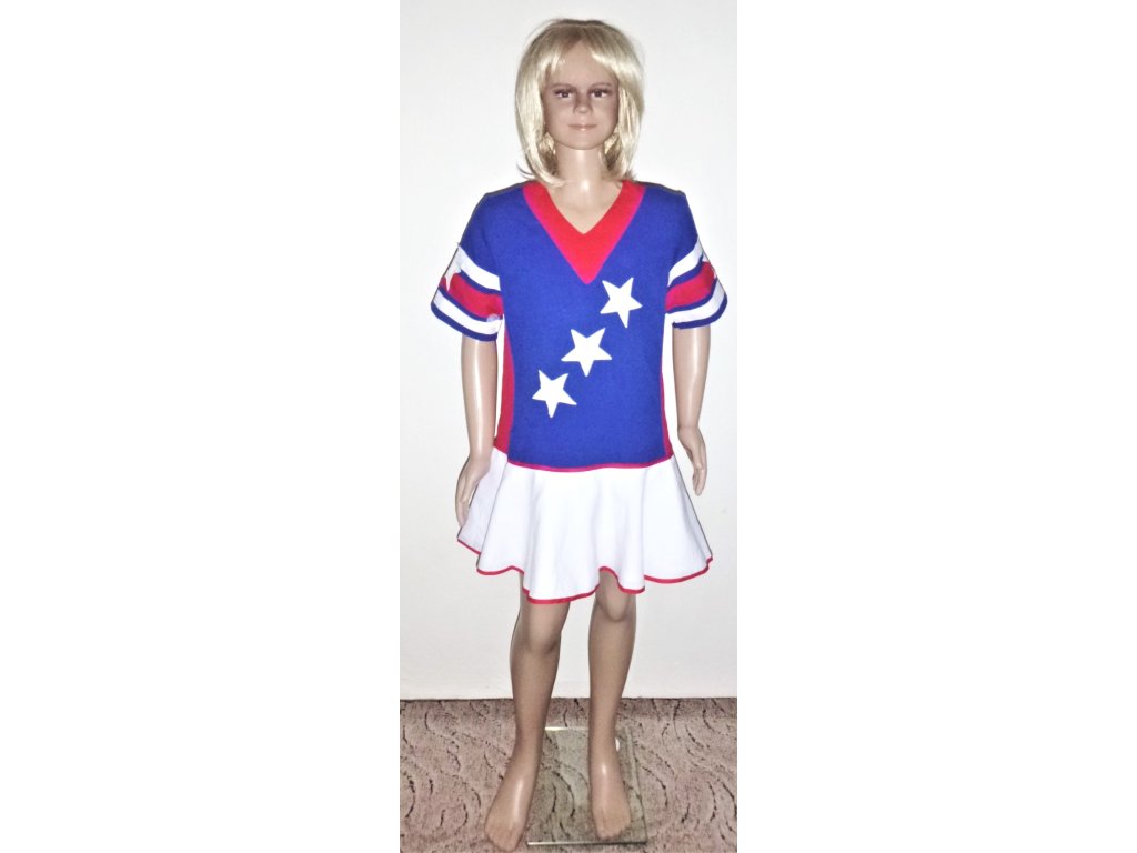 kostým roztleskávačka, dívčí kostým roztleskávačky, karnevalový kostým, kostým školačka, kostým cheerleader, dívčí kostým na karneval, kostým na dětskou párty, červenomodrobílý kostým, kostým amerika, sportovní kostým, second-hand kostým roztleskávačka, kostým s hvězdami, americká roztleskávačka