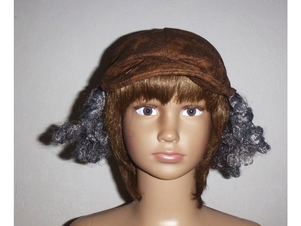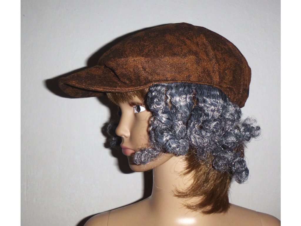 hnědá čepice s vlasy, retro čepice, historická čepice, kostým starý pán, kostým dědeček, venkovan, pekař, řemeslník, karnevalová čepice s vlasy, vtipná čepice, divadelní kostým, viktoriánská bekovka