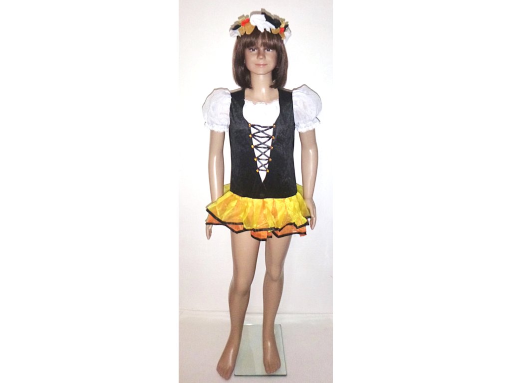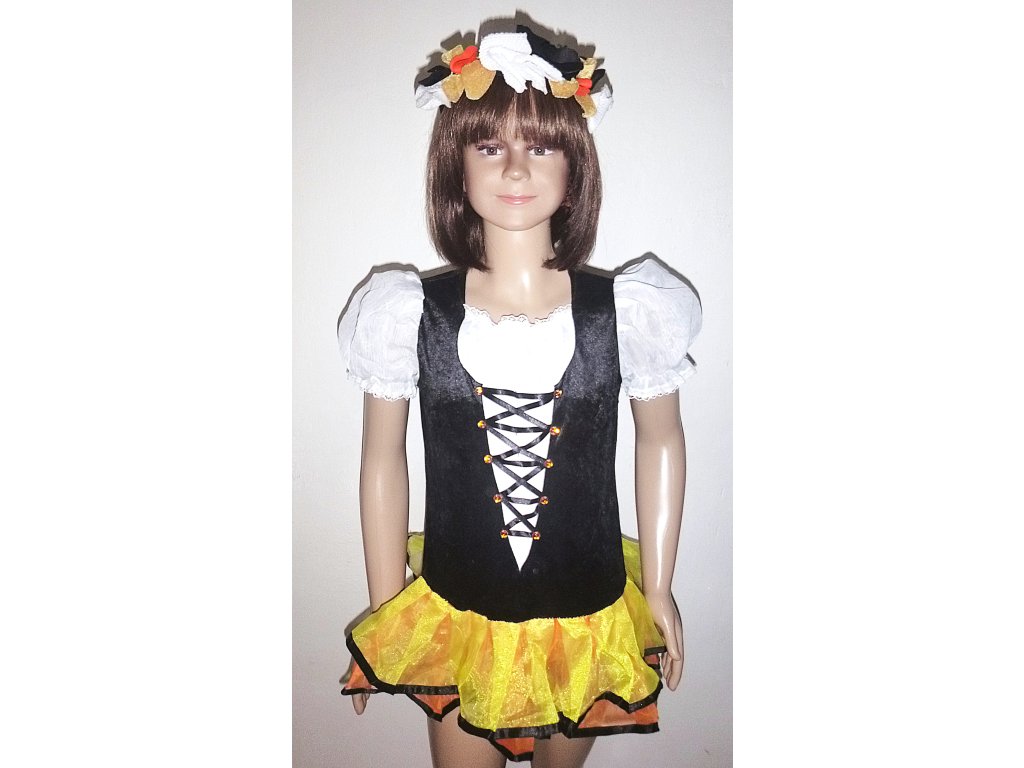 Veselá sukýnka: Spodní část tvoří oranžovo-žlutá vrstvená sukýnka s volánky, která dodává kostýmu lehkost a hravost.